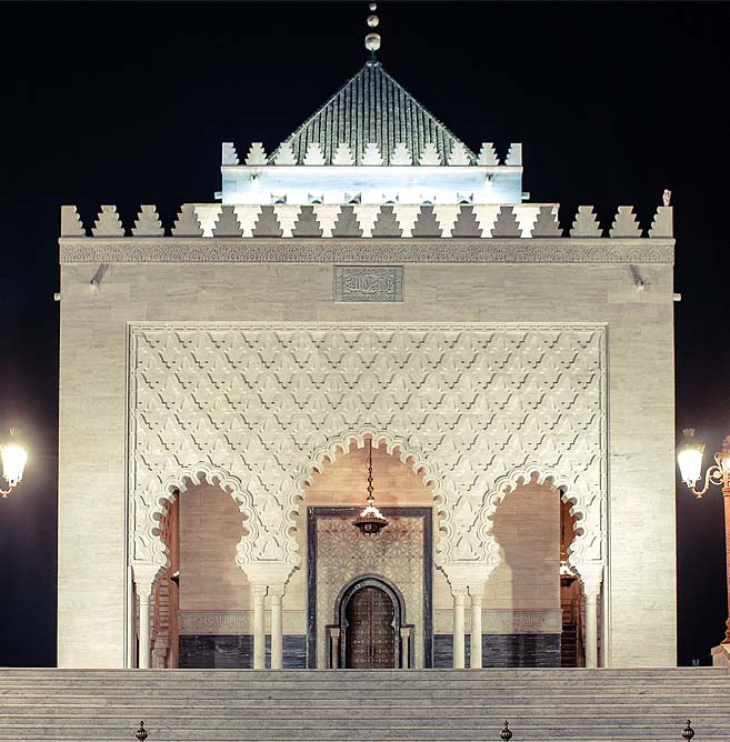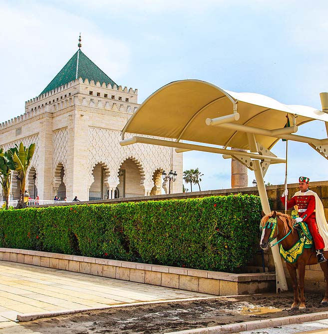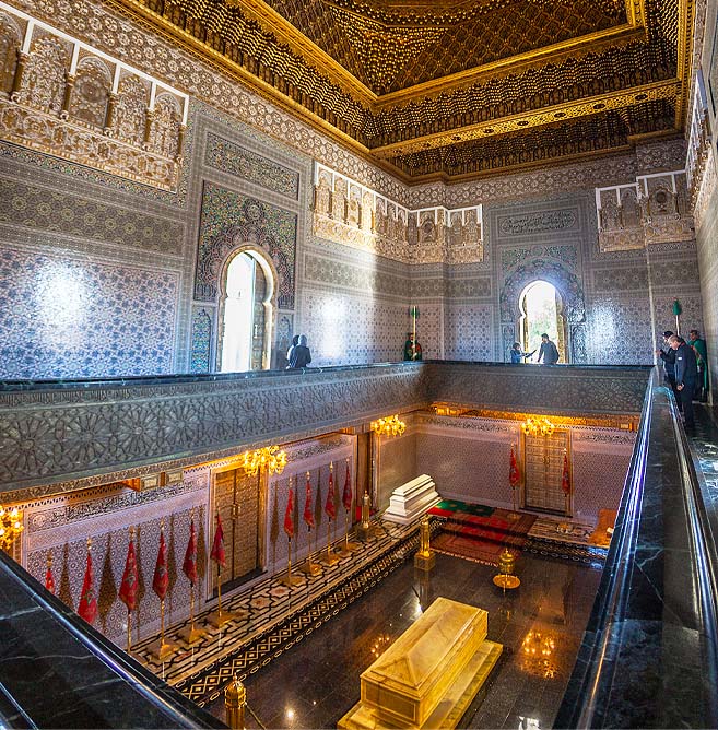 Overlooking the Hassan Tower esplanade, the Mohammed V Mausoleum is one of Rabat’s most iconic monuments. This sacred site houses the tombs of His Majesty King Mohammed V, hero of Moroccan independence, and those of his two sons, King Hassan II and Prince Moulay Abdallah. Built between 1962 and 1971, the mausoleum is a jewel of traditional Moroccan architecture. Its elegant silhouette, immaculate white marble, green pyramidal roof, zellige mosaics, and meticulous sculptures make it a true masterpiece of Islamic art. The interior, adorned with marble, carved wood, and gilding, inspires contemplation and admiration. Royal guards stand guard in full dress uniform at the entrance, adding to the solemnity of the place. The Mausoleum is open to the public and is a must-see for anyone visiting Rabat, at the crossroads of history, architecture, and national tribute.