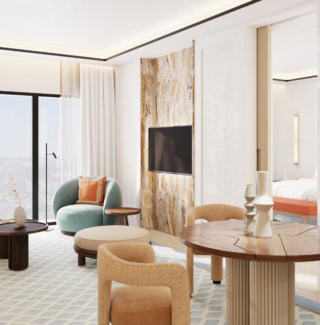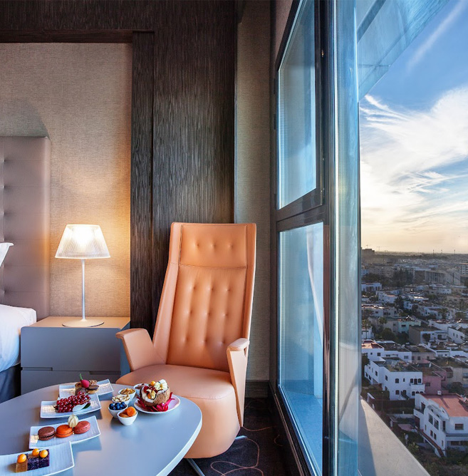 Located on Avenue Ennakhil in the modern Hay Riad district, The View Rabat is an iconic 5-star hotel in the capital. Combining contemporary design and high-end comfort, it offers spacious rooms with panoramic views of the city. Its three restaurants serve Moroccan and international cuisine in a refined atmosphere. The hotel also has an indoor swimming pool, a spa with hammam and sauna, and a modern fitness center. Ideal for a business trip or a relaxing break, The View Rabat is close to institutions and business districts, just a few minutes from the city center.