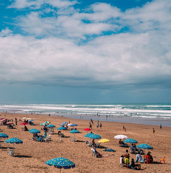 À quelques kilomètres au sud de Kénitra, la Plage de Mehdia est l’une des plus dynamiques et populaires de la région Rabat-Salé-Kénitra. Reconnue pour son ambiance jeune et sportive, elle est particulièrement appréciée des surfeurs, des familles et des promeneurs en quête d’air marin et de détente.Son sable fin, ses vagues régulières et ses écoles de surf en font un lieu incontournable pour s’initier ou se perfectionner aux sports de glisse. Les plus aventuriers peuvent également s’adonner à des activités nautiques comme le bodyboard ou le paddle.Entourée de cafés, restaurants et petites boutiques, la Plage de Mehdia séduit aussi par son côté animé, surtout en été. À proximité, la forêt de la Maâmora et la Kasbah de Mehdia, perchée sur une colline, ajoutent une touche culturelle et naturelle à l’expérience.