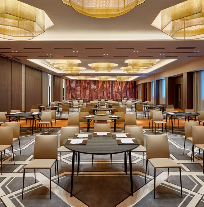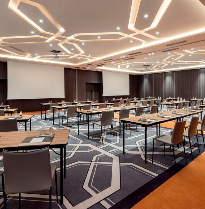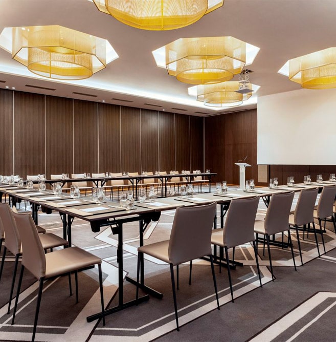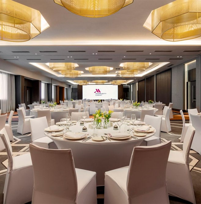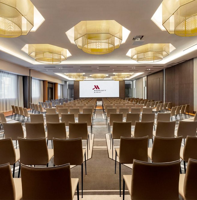 Le Rabat Marriott Hotel est un hôtel haut de gamme situé au cœur de Rabat, offrant des installations modernes et élégantes pour accueillir des événements professionnels. L’hôtel dispose de 12 salles de réunion polyvalentes totalisant 2 026 m² d’espace, avec une capacité pouvant atteindre 1 000 personnes dans la plus grande salle. Les équipements comprennent des systèmes audiovisuels de pointe, des écrans LED et une connexion Internet haut débit, garantissant un déroulement fluide des conférences et séminaires. L’hôtel propose également des espaces extérieurs comme un jardin privé et l’Esplanade des Oliviers, idéaux pour des réceptions en plein air. Ce cadre raffiné est parfait pour organiser des événements d’envergure, tout en bénéficiant d’un service personnalisé pour répondre à tous vos besoins professionnels.